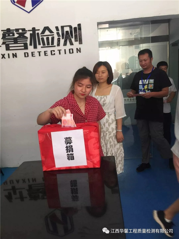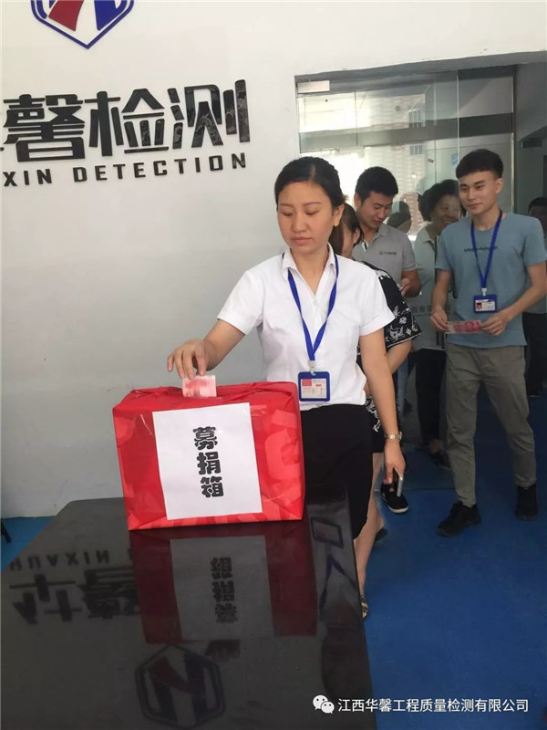 江西华馨工程质量检测有限公司心系灾区,倡导员工要有奉献爱心的良好风尚、发扬“一方有难、八方支援”的爱心精神,于2019年6月19日在全公司发起“献爱心,助灾区”募捐活动,为灾区献上一份爱心。